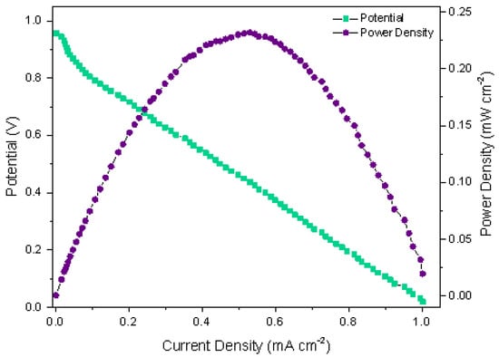 The performance of the air-breathing paper-based µFC (configuration: Pt/C and TiO2/Ni as cathode and anode, respectively) inside the qualitative pregnancy test (described in the previous section) exhibits the following performance: when the urine is collocated on the rps, the absorption by capillary action is observed in approximately 10 s, then urine makes contact with the conjugate pad and with both electrodes, while the oxygen from the air passes through the porous electrode. Thus, the oxidation–reduction reactions generate the current; the results are presented in Figure 3, and show a typical polarization curve µFC’s. The paper-based µFC shows an open circuit voltage, a maximum current density, and maximum power density of around 0.96 V, 1.00 mA cm, and 0.23 mW cm, respectively.
