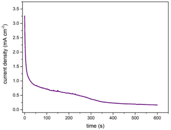 As part of the evaluation of the paper-based µFC, a chronoamperometric test using urine as fuel was performed (Figure 4). The test was carried out to observe the current density stability of the paper-based µFC at a potential corresponding to the maximum power density, according to Figure 3 (∼0.45 V). The chronoamperometric curve indicates that the current density obtained decreases over time (5 min) due to the drying of the urine on the reaction paper strip; nevertheless, the time of 5 min (300 s) is enough to produce the electric current density needed in a real application such as pregnancy tests (1 to 3 min to observe results).