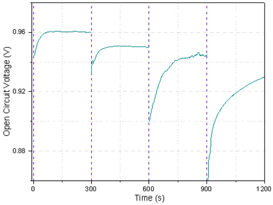 The open circuit potential (OCV) (Figure 5) was obtained to evaluate the paper-based µFC capability to recover the OCV after four cycles of charging/discharging. A potential close to the initial value of 0.96 V was reached after each discharging; however, we observed a slight decrease in the voltage (from 0.96 to 0.95 to 0.942 to 0.927 V), probably due to some of the components present in the urine (as suggested with other biological fluids, such as blood) since some of the organic molecules such as creatinine and uric acid could block the electrode surface [35]. Another possible cause could be cathode poisoning, as we discussed in other works because the cathode is on one side exposed to air and on the other side to urine. Therefore, it is exposed to several substances that could block the active sites or even cause a reaction competition on this electrode, which could result in a decrease of performance [36,37]. However, these results (chronoamperometric and charging/discharging OCV) indicate that the device could be employed in a constant short time to power a digital pregnancy test, as will be shown in the next section.