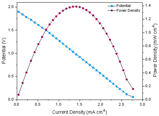 The polarization curve shows that with the presented series-parallel array, the voltage results in approximately 1.89 V, which could be used instead of common alkaline or ion-lithium batteries, while the maximum current and power density are of 2.77 mA cm and 1.38 mW cm (Table 1), respectively.