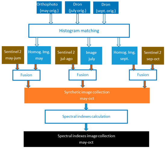 One solution to this problem is to combine or merge the higher spatial resolution information provided by aircraft images, with the temporal frequency and image quality of the multispectral sensors installed in the Sentinel 2 missions. Thus, in this article, we use the Sentinel 2 Level 2A product to merge it with orthophotos and images obtained with drones, in order to produce a series of high-resolution synthetic images. The results of the process are of considerable use for applications that require both high spatial resolution and frequent image coverage.