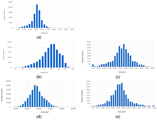 Histogram matching. (a) Histograms of band I (Infrared) of the original Image of July (reference). Following images represent histograms before (left) and after correction: (b) the original image of May, (c) the homogenized image of May, (d) the original image of September, (e) the homogenized image of September.