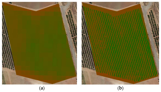 Sentinel 2’s Level 2A products provide data based on constantly calibrated and atmospherically corrected reflectances and are critical for estimating biophysical parameters and detecting land cover. There is a large amount of scientific literature aimed at establishing mathematical relationships between biophysical or soil parameters and certain spectral indices that combine information from two or more bands, such as the Normalized Difference Vegetation Index (NDVI) [3], the Green Normalized Difference Vegetation Index (GNDVI) [4], the Green Chlorophyll Index (GCI) [5], etc. However, the fact that each pixel of the image, at best, covers 10 × 10 m2 of soil, makes it impossible to discriminate the value of these indices for soil and vegetation, in plots with crops in which the planting frames are much smaller and the tops do not fully cover the ground, as is the case of the olive grove that concerns us.