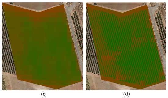 Figure 3 shows the first example of the application of this work. On the left (Figure 3a,c) are two NDVI images calculated from Sentinel 2 images (processing level 2A) obtained on 25 July and 18 September On the right (Figure 3b,d) shows the result of merging these images with the corresponding images from a drone (July image and Homogenized September image). In Figure 3a,c, due to the lower spatial resolution of the Sentinel 2 images, NDVI values can only be observed corresponding to large areas of the plot and, as expected, without being able to distinguish between soil and vegetation.