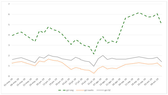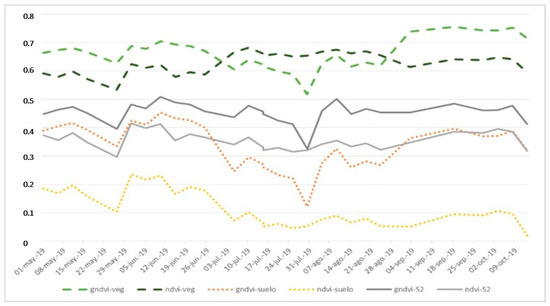 In both figures, the green lines of stripes (ndvi-veg, gndvi-veg and gci-veg) represent the values obtained from a point in the merged images (high resolution) associated with vegetation. The brown dotted lines (ndvi-soil gndvi-soil and gci-soil) represent the values obtained from a point in the fused (high resolution) images associated with soil. The continuous gray lines ndvi-S2, gndvi-S2 and gci-S2 correspond to the homologous pixel in the Sentinel 2 images.