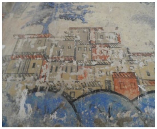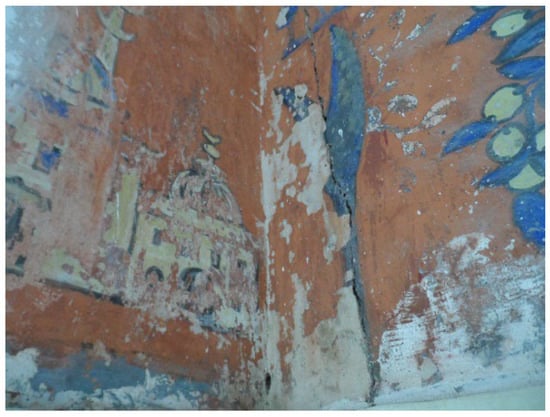 Ancient mural paintings [] are known for their precious artistic and historic value. Algerian palaces are known for their rich content of mural paintings, such as the mural paintings of Bey’s Palace in Algeria. These paintings (covering about 2000 m2 of the surface) are an original reference document that states the story of a long journey of the master of the place, which can serve as a reference for researchers and historians. They certainly are the major attraction of the palace, showing their extraordinary character in Algeria and North Africa. They disclose many secrets that make it possible to read about many historical events such as the fights against the French army in which the Bey took part alongside the Dey of Algiers, in addition to the Bey’s many trips to the Middle East. These precious paintings are highly degraded and hard to maintain. Ancient mural paintings suffer from different degradation types due to natural impacts, changes in temperature and humidity [], as well as human ignorance to preserve the paintings without knowing their value []. Most of the degradation are cracks, detachment, flacking, and so on. Lacunae are a typical type of damage caused by degradation. The lacunae regions, seen in Figure 1, can vary widely in size, from very small regions to large pores, and often have complex and irregular shapes.