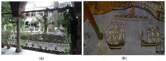 The Haj Ahmed palace: (a) the patio of Haj Ahmed palace; (b) the image depicting Ahmed’s pilgrimage to Mecca.
