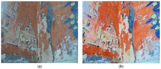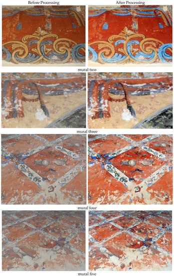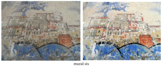 The main challenge related to our data is the unclearness of the content’s visibility. Typically, the visibility of this kind of data heritage is affected because it is captured under insufficient and unstable lighting conditions in the environment and due to unavoidable environmental problems such as the dust presented on murals as well as to some technical constraints during image capturing [] where the conservator or restorer is unable to discern the true colors of the objects in these pictures []. The primary objective in this step is to overcome this problem by enhancing the quality and improving the visibility of the images which is needed for further processing and analysis.