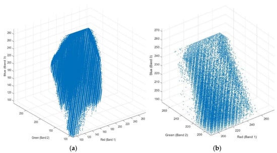 The 3D plot of R, G and B bands, (a) un-enhanced image, (b) image enhanced.