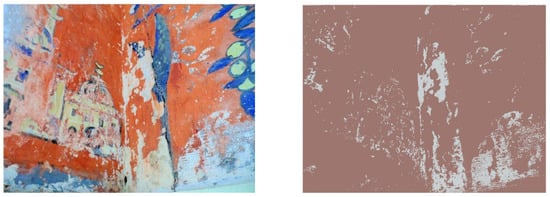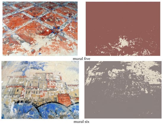 By using the average mean of each color channel in RGB space, we take into account the different characteristic colors of each image. For each class (each element presents in the images), RGB values of 4112 pixels were registered as a reference for lacuna class and 86,240 pixels were registered as a reference for non-lacunae class. For the image classification, each pixel of the images was assigned to the most proximate class according to Mahalanobis Distance. This distance takes into account the covariance between variables (red, green, and blue (RGB) values) which was reported to induce misclassifications on RGB images. Figure 11 shows the output for mural one of lacunae extraction through Mahalanobis Distance. According to the results shown in Figure 11, lacunae regions of mural one were extracted successfully by using Mahalanobis Distance. In Figure 12, we present a similar result for the rest of the murals extraction.