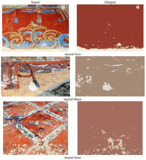 An approach for mural deterioration detection using a multi-path convolutional neural network (CNN), was proposed by Huang et al. []. This method uses images of a scene with many lightings as inputs, after that it creates a binary map that indicates deterioration areas. The authors used seven-paths CNN for basic feature extraction from lighted images, and one path is used for cross-feature fusion. Moreover, they built two realistic mural deterioration datasets of real-world mural deterioration and briquettes that simulate the cave deterioration. Paint loss detection in digital painting “Ghent Altarpiece” by [] is a recent and important study. First, this study proposed a general multimodal object detection technique based on sparse representation, in which the spatial features of various imaging modalities are merged in the kernel feature space through a kernel function. Additionally, spatial context is used by applying a smoothing filter to the representation residuals. Furthermore, a majority voting approach is introduced, overcoming the inevitable problem of imperfect annotation. A deep learning-based MCSN mural classification model was designed by [] to classify murals under the effect of complex environments such as lighting and mural resemblance. The results show that the model improves the efficiency and accuracy of mural classification and can provide a convenient and time-saving method for scholars devoted to the identification and classification of mural dynasties, thus improving the effectiveness of mural classification. Pre-trained AlexNet and VGGNet models were used by Kumar et al. [] for extracting features and classifying murals to address the insufficiency of existing mural datasets. Since the murals contain a lot of background noise, the extracting feature directly affects the classification quality.