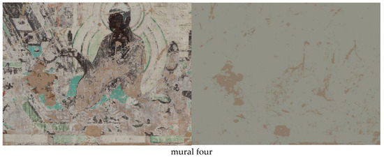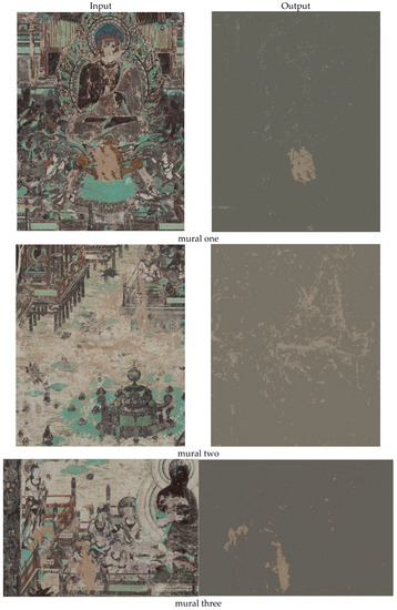 We also evaluated our proposed approach on various images of ancient mural paintings of Mogao Caves in China. These data were provided by Wuhan Dashi Smart Technology company []. In the 20th century, Dunhuang Mogao Caves were considered one of the greatest cultural discoveries of all time because of their colorful mural paintings. The effects of time, physics, and human activity lead to generate lacunae and many kinds of deterioration to these priceless mural paintings. The data provided by Daspatial are high-resolution RGB images that were not preprocessed of four murals of complex backgrounds with different spatial size as follows: mural one with a dimension of 2911× 3799, mural two with a dimension of 2779 × 3313, mural three with a dimension of 2929 × 1991, and mural four with a dimension of 2505 × 1880.