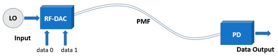 The PMF link consists of three different parts: a radio frequency digital-to-analog converter (RF-DAC), a rectangular high-density (with a density above 0.930 g/cm3) polyethylene (HD-PE) fiber acting as a flexible dielectric waveguide, and a power detector (PD), which receives the signal and demodulates it. A simplified illustration of the PMF link can be seen in Figure 1. An LO at desired output frequency is applied to the RF-DAC, where the data modulate the signal into an amplitude modulated signal. The signal is then transmitted over the PMF to a power detector (PD), where the signal is demodulated.