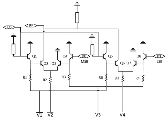 The topology uses emitter-coupled pairs (ECP), which function as a switch, to enable low power operation as well as fast switching (high data rate). An LO input is modulated to a PAM signal through different levels of amplification/attenuation applied to the signal. Furthermore, two ECPs are used for the PAM-4 signal. One pair is used for the most significant bit (MSB) and one for the least significant bit (LSB). The circuit is biased with negative voltage (V1 = −1.2 V, V2 = −2.8 V, V3 = −1 V, V4 = −1.7 V). A simplified schematic of the proposed PAM-4 modulator can be seen in Figure 2.