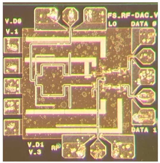 A photo of the RF-DAC-based PAM-4 modulator can be seen in Figure 3. The LO input signal is applied on the right side and the RF output signal is delivered at the left side of the chip. Dc bias is applied on the top, while the two data input ports are located at the bottom.