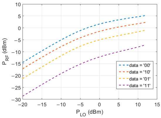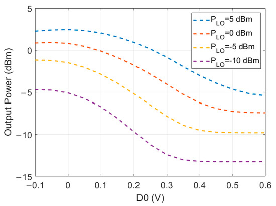 In Figure 4, a simulation of the output power while sweeping the data input voltages between −0.1 and 0.6 V can be seen. Four different LO power levels were used (−10 dBm, −5 dBm, 0 dBm, and 5 dBm).
