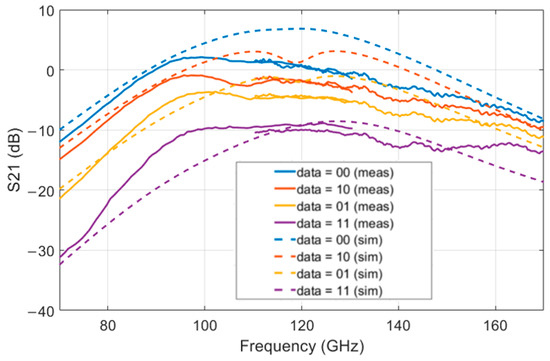 S21 for the different digital data input. LO is port 1 and RF is port 2. The measured results are shown in the solid lines and the simulated results in the dashed lines. The LO input power is −6 dBm.