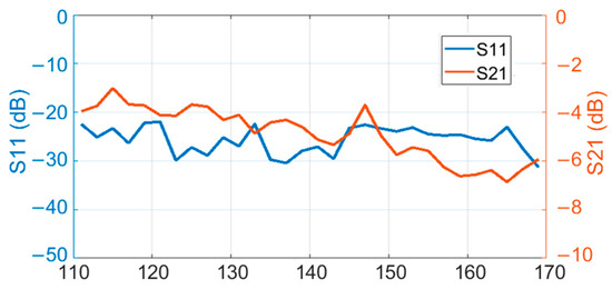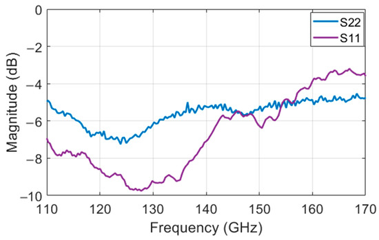 The output of the PD (DC voltage) was measured by a multimeter. The output voltage corresponding to different input power is plotted in Figure 10 for 120 GHz, 130 GHz, 140 GHz, and 150 GHz. As the input power increased from 0 to 1 mW, the output voltage changed 1.1 V, which agreed with the simulation.