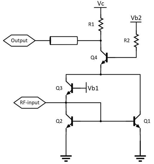 As shown in Figure 8, a common-emitter configured transistor, Q1, and a common-base configured transistor, Q3, are used as nonlinear components for power detectors. Their collector currents are added and applied at the stacked transistor Q4, to amplify the output signal. The output of the power detector is taken at the collector of Q4. The collector and base of Q2 are connected to form a diode, which provides a DC path for Q3, and DC-bias for Q1.