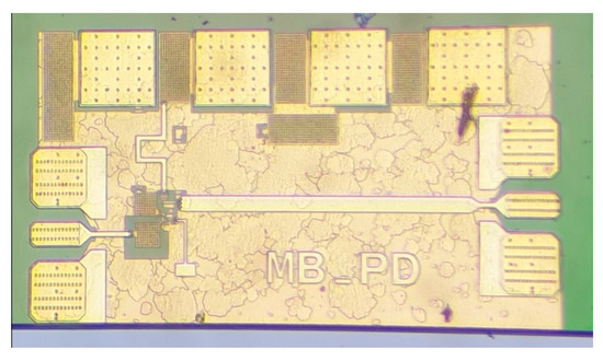 A photo of the fabricated PD can be seen in Figure 9. The RF input signal port is located on the left side of the MMIC, while the output port is located on the right side. The DC bias is supplied at the top. The total size of the MMIC including pads is 0.28 mm2, and 0.11 mm2 without pads.