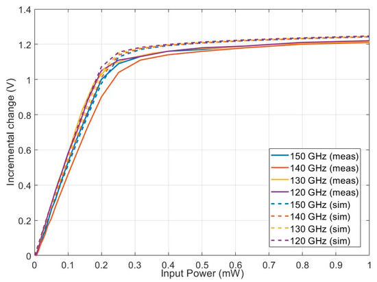 Incremental output voltage change for different input powers applied. Each trace corre sponds to a different frequency (120 GHz, 130 GHz, 140 GHz, and 150 GHz).