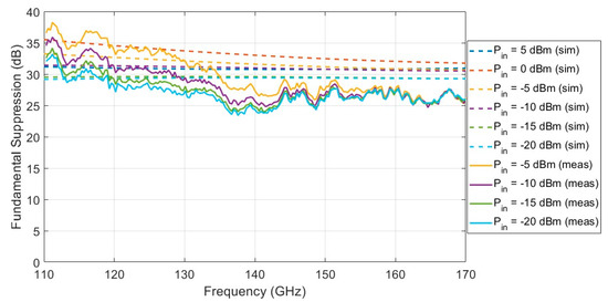 Simulated and measured suppression of the fundamental at the output of the PD. Six different values for the input power were used, from −20 dBm to 5 dBm during the simulation, and four different values for the input power were used, from −20 dBm to −5 dBm during the measurement.