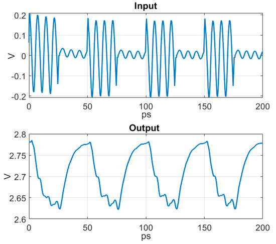 Time domain simulated input and corresponding output from the PD. The carrier frequency is 140 GHz.