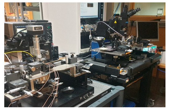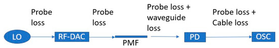 The entire link was tested in the time domain, transferring data in real time. The output from the PD was then connected using a coaxial cable to a Lecroy LabMaster 10–100 Zi real-time oscilloscope, where the signal could be analyzed. A photo of the fiber connecting the circuits on each probe station can be seen in Figure 16.