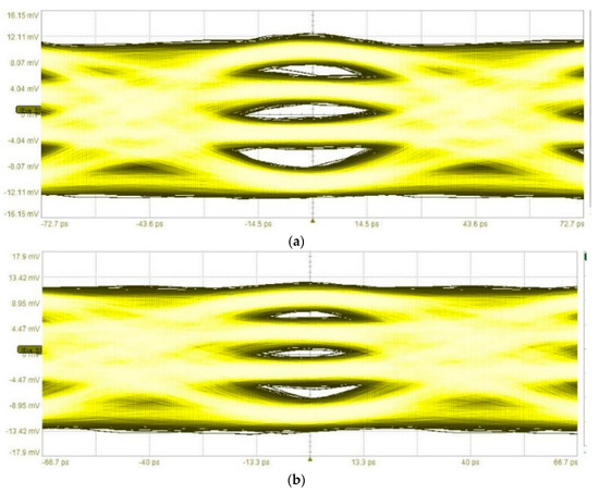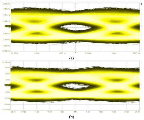 First, the PMF link was tested using only one data input (MSB) to create a PAM-2 modulated signal. Bit rates up to 32 Gbps were measured and the data input that was used was a PRBS-9 stream. The eye diagram of the output signal from the PD can be seen in Figure 17a for a 30 Gbps signal and in Figure 17b for a 32 Gbps signal. For a 32 Gbps signal, the bit error rate (BER) was 2.6 × 10−10.