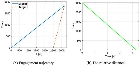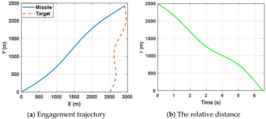 Figure 9a shows the trajectories of the missile confronting the target, which is expected to perform a sin-ware maneuver by selecting the proposed guidance law. Figure 9b presents the change in the relative distance between the missile and the target and it can be observed that the miss distance is less than 0.5 m. By combining (a) and (b), the results reveal that the missile intercepts the maneuvering target successfully.