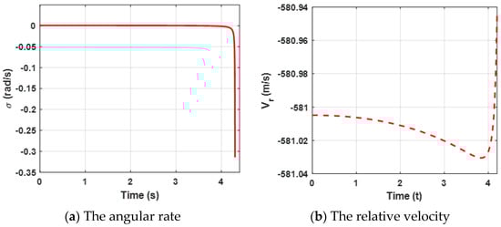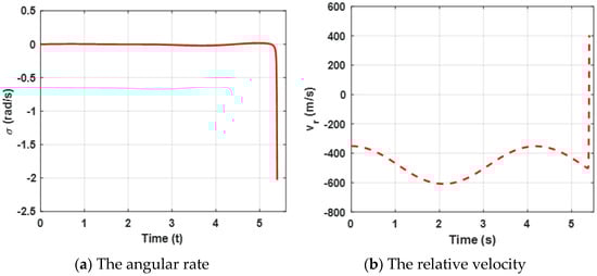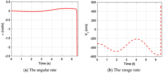 Both the angular rate and the relative velocity are presented in Figure 3. From Figure 3a, it can be observed that the state variable (the angular rate) bound is zero at about 4.5 s, which leads the ZEMD to be zero according to the Equation (57) and Figure 2b. tends to be zero, which can ensure that the missile intercepts the target. Furthermore, the negative guarantees the relative distance between the missile and the target tends to be zero in Figure 3b. Moreover, sharp changes between and are reasonable due to the system characteristics. Furthermore, it also verifies Definition 2, which mentioned that .