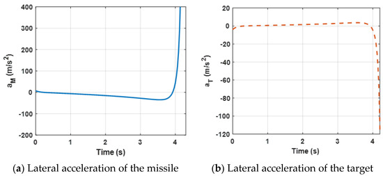 Figure 4 presents lateral acceleration curves of the target and the missile. It can be observed that both lateral accelerations are maintained within a reasonable range, which can ensure that the missile intercepts the target. However, due to the system characteristics, the lateral accelerations decrease sharply at the end of the engagement.