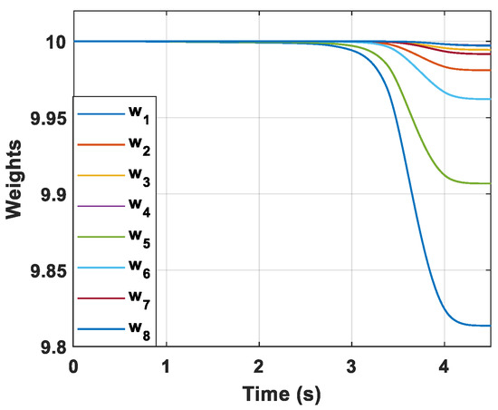 It can be observed from (24) that bound can be decreased by increasing the eigenvalue K. Therefore, is quantified by selecting the minimum eigenvalue . According to (19) and the relationship between and , the smaller will enforce the to converge into a small bound. Therefore, we have and it can be concluded that and are UUB.
