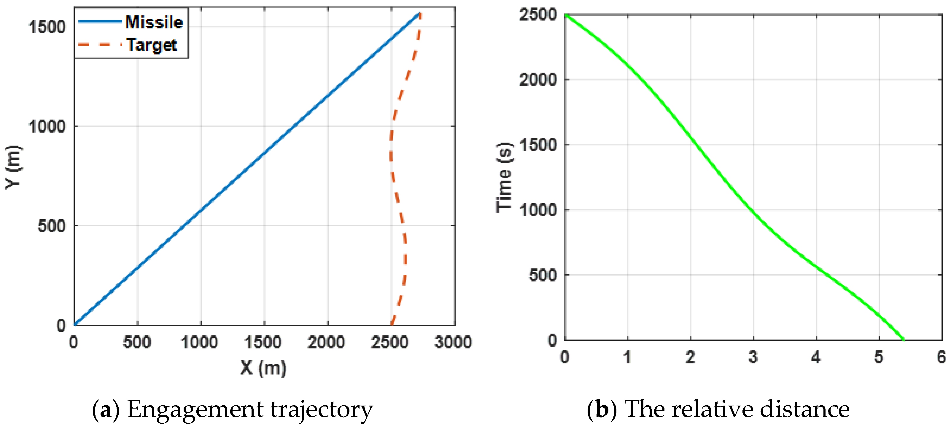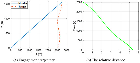 Figure 6a shows the engagement trajectories of the missile confronting the target, which is expected to perform a sin-wave maneuver by selecting the proposed guidance law (34). Figure 6b presents the change in the relative distance between the missile and the target and it can be observed that the final ZEMD is less than 0.5 m. The results reveal that the missile intercepts the maneuvering target successfully.