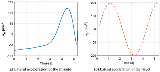 Figure 8 presents the lateral acceleration curves of the target and the missile. It can be observed that both lateral accelerations are maintained within a reasonable range, which can ensure that the missile intercepts the target. Furthermore, compared with Figure 4a, due to the maneuvering target, higher acceleration demands of the missile are needed.