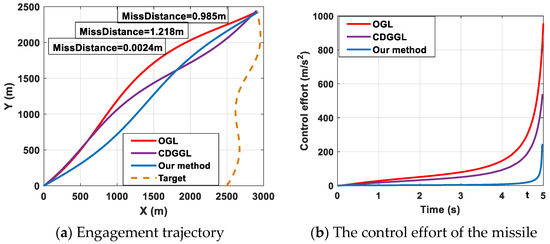 From Table 1, it is easily found that less control effort is needed in our proposed method compared with the OGL in [4] and the CDGGL in [18], which implies that our proposed guidance law can reduce unnecessary energy consumption. The missile can intercept the target with minimal control. Moreover, the computation time of our proposed method is shorter compared with the OGL in [4] and the CDGGL in [18], which means that our proposed method can make the confrontation strategy in the shortest time. In general, our proposed guidance law can intercept targets with minimal control effort and a fast response.