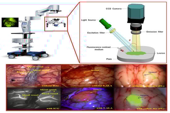 - Kim, H.R.; Lee, H.M.; Yoo, H.; Lee, S.H.; Kim, K.G. Review of Neurosurgical Fluorescence Imaging Systems for Clinical Application. J. Opt. Soc. Korea 2016, 20, 305–313. [Google Scholar] [CrossRef]