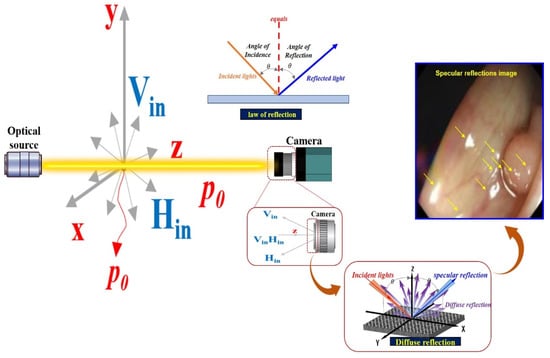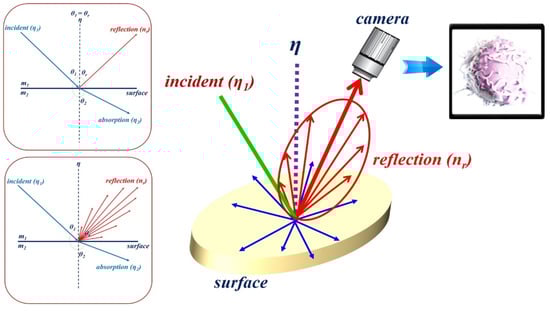 However, specular reflection in observational images is attributed to the influence of tissue density and mucosal moisture status. As shown in Figure 3, for the light () irradiated from the LED, according to Snell’s law, a part of the light () has a refraction angle () that is absorbed by the tissue, and the remaining light is reflected (). Therefore, η1 is equal to ( = ( = )) []. As a result, as in Equation (1), a difference between the incident angle () and reflection angle () occurs, resulting in specular reflection.