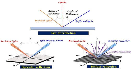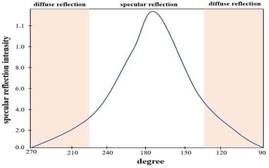 Thus, the specular reflection angle is changed from 0 to 180°, and it is called diffuse reflection () []. The specular reflection () is given by Equation (2). Accordingly, includes and , where , , and are the wavelength of diffuse reflection and the incident and reflection angles, respectively.