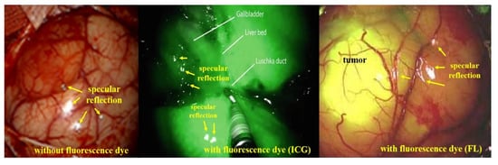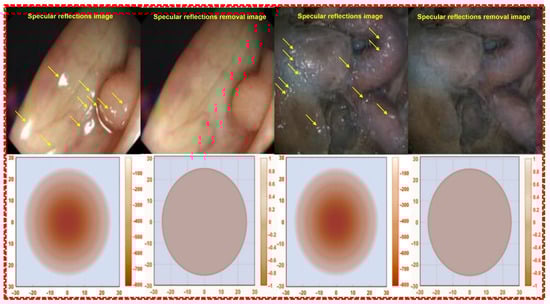 Therefore, as shown in Figure 6, images acquired based on specular reflection generate white light during endoscopy, tumor observation, and blood circulation []. If such specular reflection occurs in an important lesion area of the image, it may interfere with the observation field and cause a diagnosis error [].