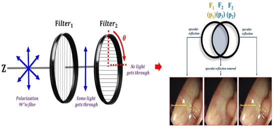 In the medical field, most approaches have attempted to minimize specular reflection by adjusting the direction angle of the camera. There are two methods of capturing the polarization effect of the camera: a method of irradiating the focal point of the LED in various directions and a method of controlling the focal length of the LED beam []; however, adjusting the direction angle and focal length of the LED beam is not easy []. In addition, the best tool for specular reflection suppression is a method of detecting specular reflection. These specular reflections are generated in the process of spatial transformation with red–green–blue (RGB) color functions for the brightness and color of the camera []. The detected specular reflection removes the reflection region through deconvolution analysis in the wavelength band. The color image lost due to specular reflection removal uses a separate function to restore the lost color []. This reflected wave removal process requires extensive data, calculations, and complex mathematical operations []. The method of collecting frames through continuous shooting requires the reference image to be trained in advance []. This method compares the interval between the actual shooting frames and the reference training image interval and calculates the sum and difference. Therefore, by removing the image for the calculated difference, the calculated value can be used to remove the reflected light []. However, this method requires a complex collection process for lesion data, normal tissue data, and data for learning reference images [].