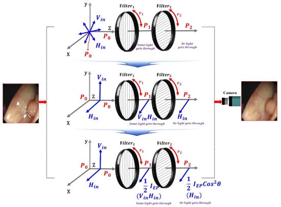 Filter1 is fixed as shown in Figure 10, and when the rotation direction angle (r1) is 0°, Vin and Hin incident on the filter have vertical polarization and horizontal polarization at P0. At this time, when Vin and Hin pass through Filter1, both Vin and Hin are changed to the horizontally polarized waves at P1. Assuming that the direction angle (r1) of Filter1 becomes 0° and the direction angle (r2) of Filter2 rotates, Vin and Hin passing through the filter are polarized as in Equations (8)–(11), affecting P3. Therefore, the specular reflection can be sufficiently removed.