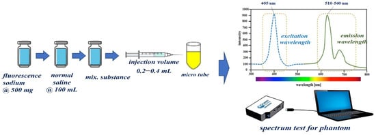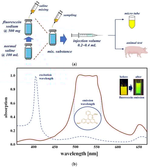 A fluorescence contrast agent was used to obtain the experimental results for specular reflection removal images using phantom and animal experiments. The fluorescence contrast medium was fluorescein sodium, as shown in Figure 13a, and the fluorescein sodium (500 mg) reagent was prepared with the optimal concentration (5.0 mg/mL) of fluorescein sodium by dilution with normal saline (100 mL). Additionally, fluorescein sodium (500 mg/mL) was diluted with 100 mL of normal saline to ensure a dilution value of five times or more. Fluorescein sodium that satisfied the dilution produced an injection volume of 0.2–0.4 mL using a syringe. The fluorescein sodium (dilution) was injected (syringe: 0.2–0.4 mL) into the phantom, micro tube, and vein (for pre/clinical test).