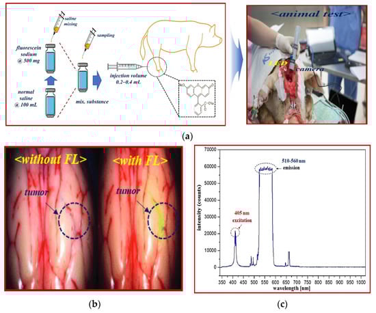 As shown in Figure 1, the fluorescence imaging device acquires images through injection of a fluorescence contrast agent, irradiation with an external light source, and imaging. At this time, blood vessels or tumors are classified by color and observed through images. The purpose of using a fluorescence contrast agent is to observe status of blood vessel flow, remove the tumor through fluorescent staining, and follow up on the state of the tissue remaining after tumor resection [,,].