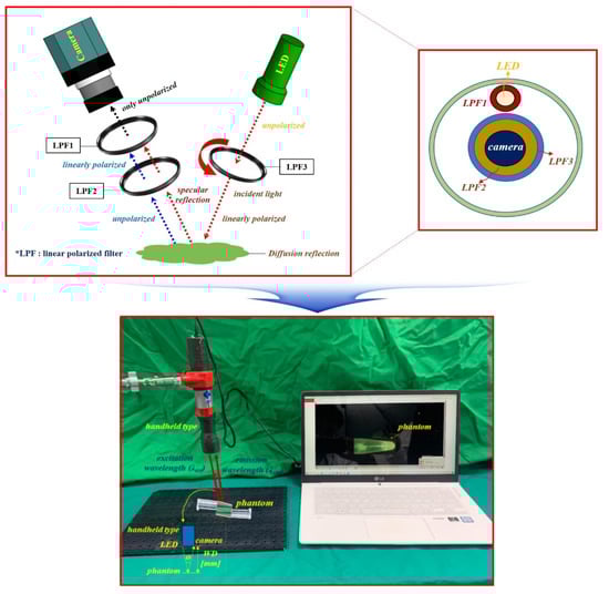 Therefore, a filter is used to remove such specular reflection. There are several types of filters used, such as ultraviolet (UV) filters, skylight filters, polarizer (PL) filters, and neutral density (ND) filters []. UV and skylight filters are mainly used to reduce specular reflection caused by UV rays []. The PL filter is used to reduce diffuse reflection, and the ND filter is used to reduce specular reflection by uniformly reducing the amount of light to balance the color image in its entirety []. However, these filters are mainly suitable for shooting in bright natural environments. The PL filter is widely used because it shows excellent performance in terms of reducing light reflection []. However, PL filters have the disadvantage of darkening the background; this was first studied in phantom experiments and published in subsequent papers []. Therefore, if a PL filter is used in a state that only relies on LED light in a dark human body, light reflection is effectively reduced. However, the method of using the PL filter has limitations in securing the lesion field of view owing to the dark image []. Therefore, research to effectively remove specular reflection in a dark environment and observe the lesion in a bright field of view is necessary.