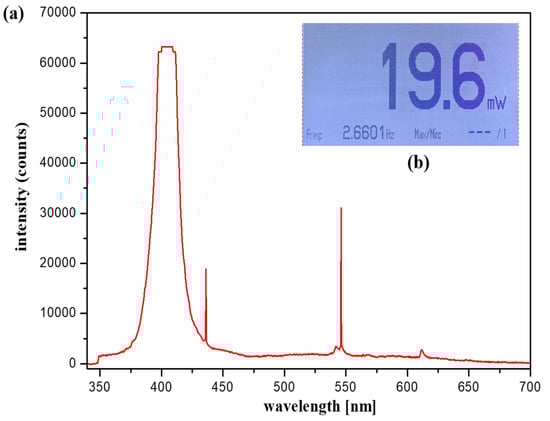 For accurate imaging, a self-made, handheld-type fluorescence surgical microscope was fixed in position using a clamp device. The working distance (WD) from the camera and the LED to the phantom was 3 cm, and the angle (θ) between the LED and the camera to focus the beam was approximately 15°. For the LED used in the experiment, the wavelength and output level of the light source were measured before use. Measurements were obtained using a spectrum meter and a power meter. As shown in Figure 16, the irradiation (λext) wavelength of the LED was 405 nm, and the irradiation power (Pext) was approximately 19.6 mW.