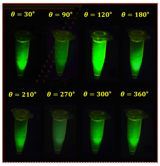 Figure 17 shows the results of the experiment based on the fabrication of the fluorescein sodium liquid vial phantom. The first filter (Filter1) was fixed, and the second filter (Filter2) was rotated at regular intervals to capture the image. When the rotation angle (θ) of the filter was rotated to 30°, 90°, 120°, 180°, 210°, 270°, 300°, and 360°, the image with reduced specular reflection could be observed. In particular, when the rotation angle (θ) was 90° and 270°, the specular reflection was sufficiently reduced, and other results were analyzed differently depending on the rotation angle (θ) in the intensity of the specular reflected light. To obtain reliable results, this experiment was performed five times (without LPF and with LPF states), and consistent results were obtained.