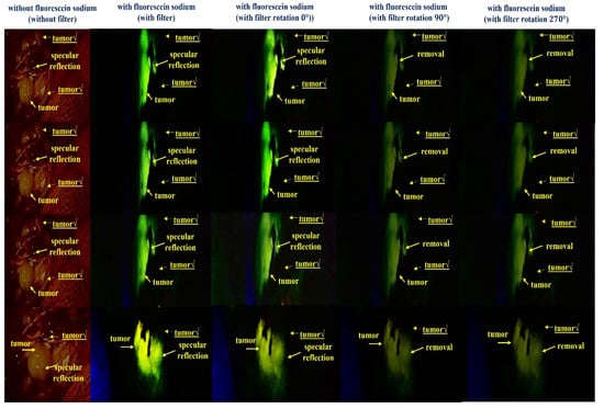 Figure 18 shows the results of a reflex removal experiment using a large animal (pig). As observed in the figure, the experimental results show the state of blood flow through the fluorescent sodium fluorescein. For fluorescence images, an LED mounted on a self-manufactured handheld fluorescence surgical microscope irradiated the picture, and image data were collected through NIR camera imaging. After that, the results of the imaging experiment could be observed through an external monitor. In addition, Figure 18 shows the entire tumor before fluorescein sodium injection in the without filter (without fluorescein sodium) section. At this time, it was confirmed that light reflection occurred, and the with filter (with fluorescein sodium) part comprised the same tumor (←tumor maker) as the without filter part, and the same part was photographed three times for reproducibility. At this time, in a state in which the tumor was partially removed, fluorescein sodium was injected, and fluorescence was stained. Therefore, it is the result of comparing and observing the fluorescence state (←tumor maker) when the tumor is present (←tumor) and the non-fluorescent state (←tumor√) when the tumor is removed. Therefore, the reason that the shape of the tumor in the without filter (without fluorescein sodium) and with filter (with fluorescein sodium) parts is inevitably different is that the difference between the state in which the tumor is not removed and the state in which the tumor is partially removed for the fluorescence expression test cannot be compared. When irradiated with a light source from the outside, the performance of the state in which fluorescence is not expressed in the removed tumor (←tumor√) and the state of fluorescence in the non-removed tumor (←tumor) was tested. At this time, it was confirmed that light reflection still occurred in the fluorescence-expressed tumor (←tumor), and because we used a filter to remove the light reflection, it was confirmed that the light reflection was sufficiently removed when three shots were taken.