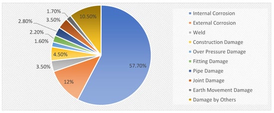 Corrosion assessment and monitoring are valuable for applications in the oil and gas (OG) industry because corrosion factors lead to great economic damage, which is a large amount of the total global cost for OG industries yearly [1,2,3]. The impact of corrosion in the field of OG industries can be assessed based on its effect on operational expenditure and capital expenditure, including health, safety, and environment [4]. According to the production pipeline failure data between 1980 and 2005 in Alberta [5], Canada, corrosion is one of the main factors causing a pipeline failure. Figure 1 shows the percentages of several causes that contribute to pipeline failure.