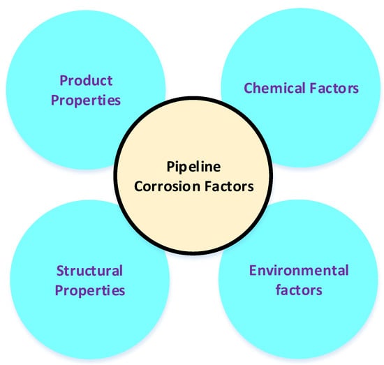 Corrosion of the carbon–steel pipeline can be attributed to several causes, including structural properties, materials properties, chemical factors, and environmental factors, as shown in Figure 2. These factors can further breakdown individually for better understanding. For example, material properties, residual and operating stresses, design factors, crevices, deposits, and others are associated with structural properties; temperature, pressure, flow rate, entrained solid and liquid and flow pattern are related to product properties; chemical factors included , , , dissolved solids, organic and inorganic acids, sulphur and sulphur compounds, microorganisms, hydrocarbons and pH; environmental factors associated with oil field composition, soil composition, temperature and moisture levels, saltwater, freshwater and land [8]. This article focuses on numerous methods developed for corrosion assessment and monitoring in OG industries.